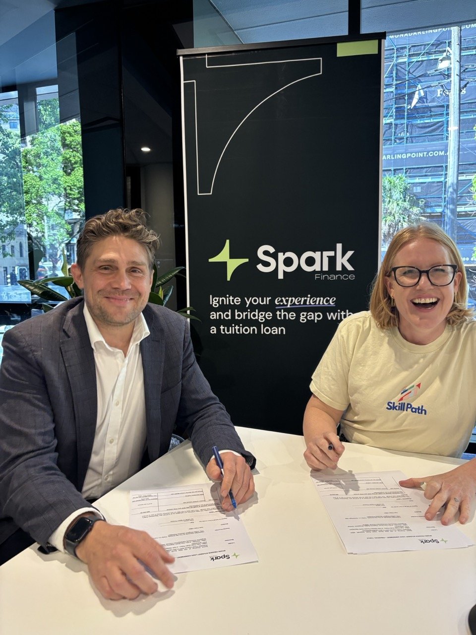 Spark Finance co-founder Ewen Hollingsworth and Skill Path founder Steph Cousins signing agreement to work together to establish the Refugee Student Loan Program, October 2025.