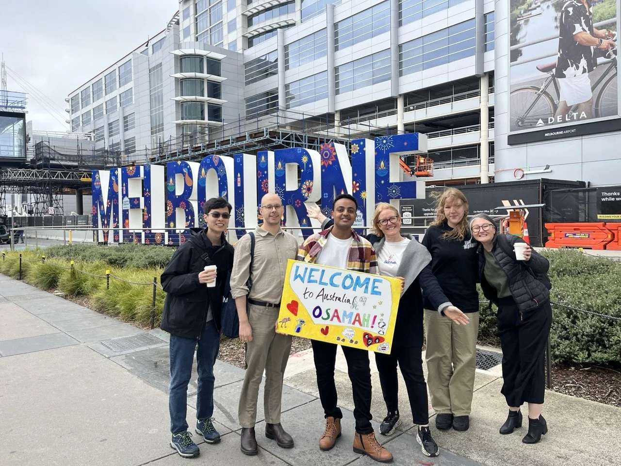 Osama and the welcoming committee from Skill Path and University of Melbourne, Melbourne Airport, October 2025